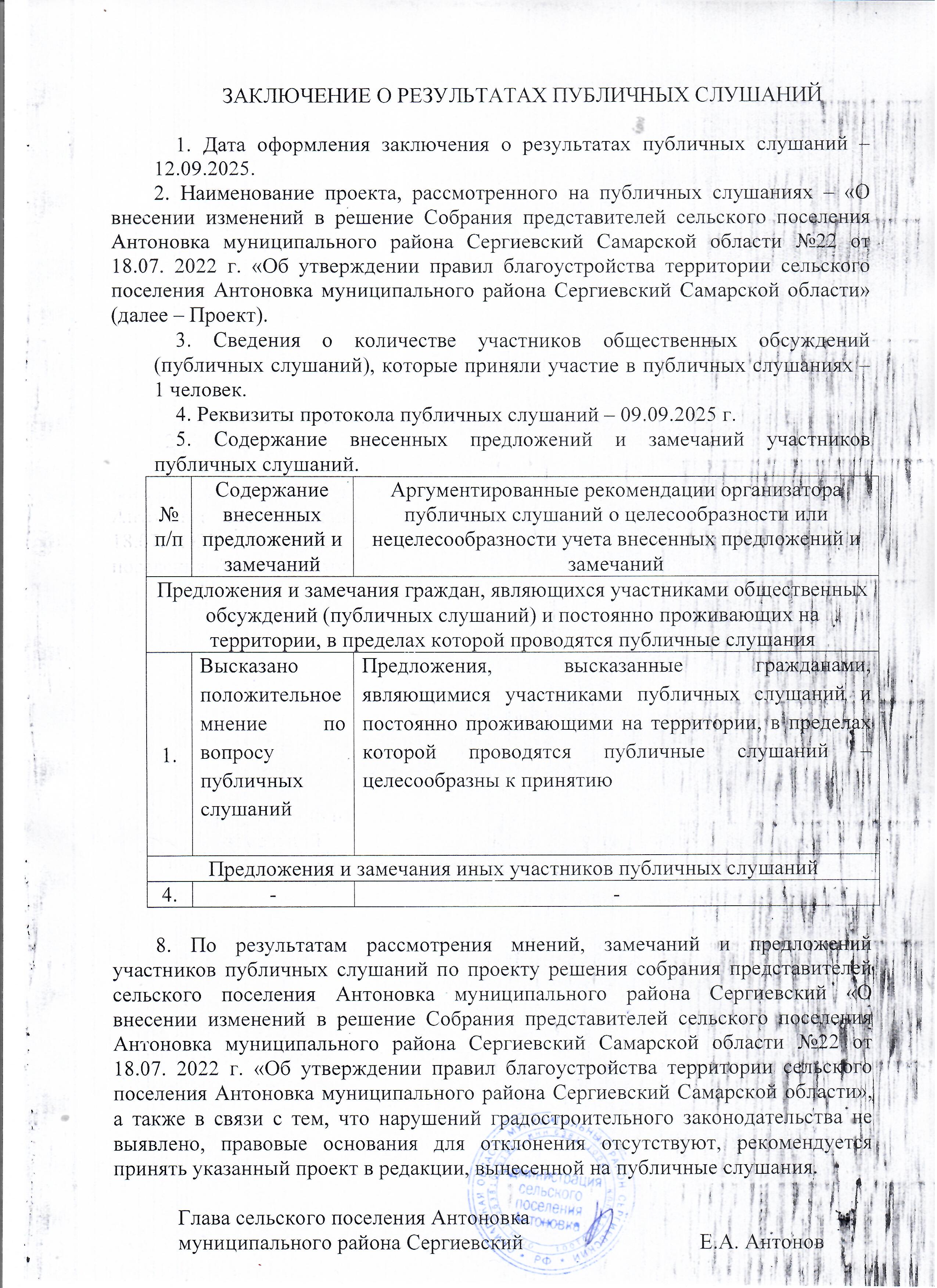 Решение №1 от 16.01.2025г. «О внесении изменений в решение Собрания представителей сельского поселения Антоновка муниципального района Сергиевский Самарской области №22 от 18.07. 2022 г. «Об утверждении правил благоустройства территории сельского поселения Антоновка муниципального района Сергиевский Самарской области»