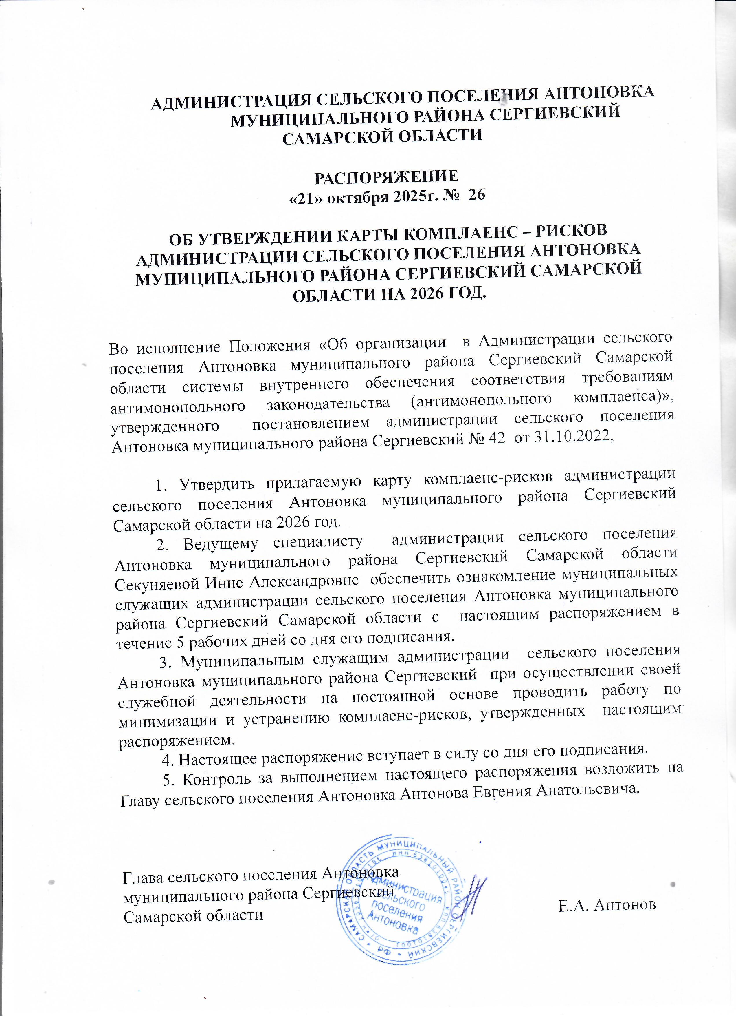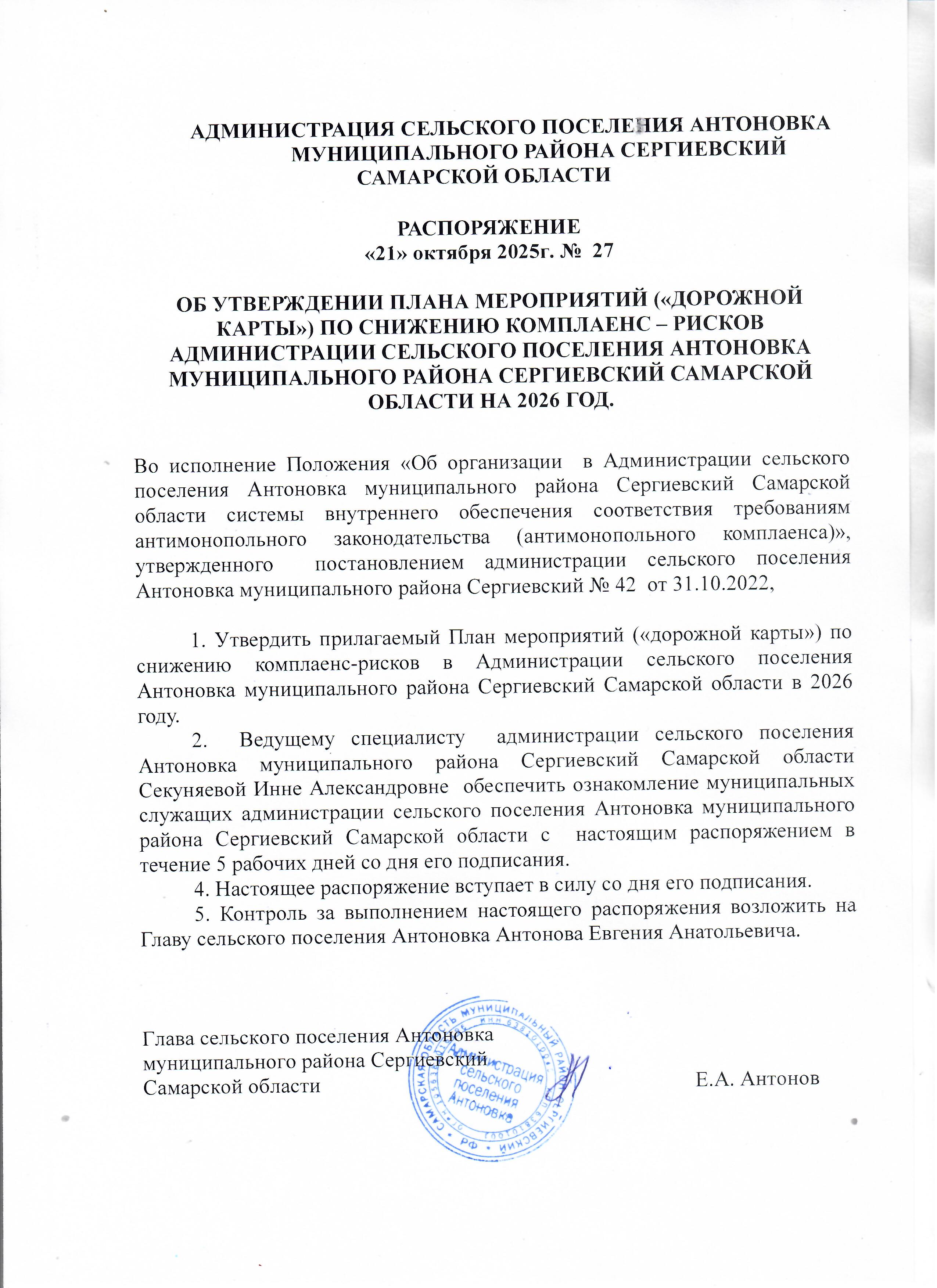Распоряжение №26-р от 18.10.2024 г. «Об утверждении Плана мероприятий («дорожной карты») по снижению комплаенс-рисков в Администрации сельского поселения Антоновка муниципального района Сергиевский Самарской области в 2025 году»