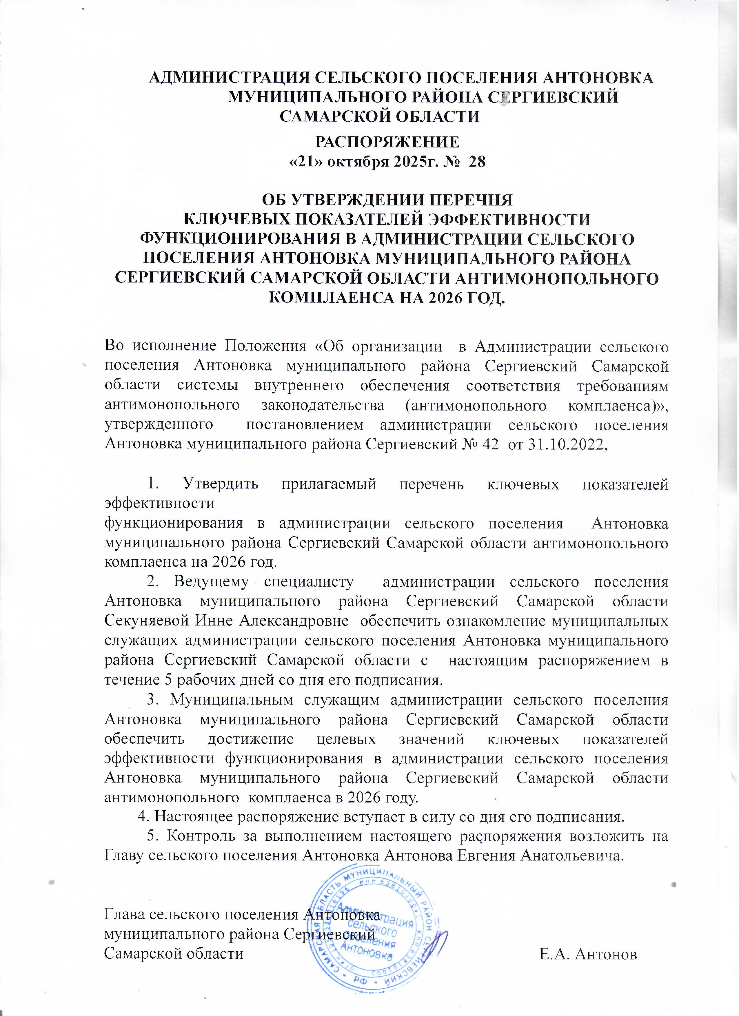 Распоряжение №27-р от 18.10.2024 г. Об утверждении перечня ключевых показателей эффективности функционирования в администрации сельского поселения Антоновка муниципального района Сергиевский Самарской области антимонопольного комплаенса на 2025 год