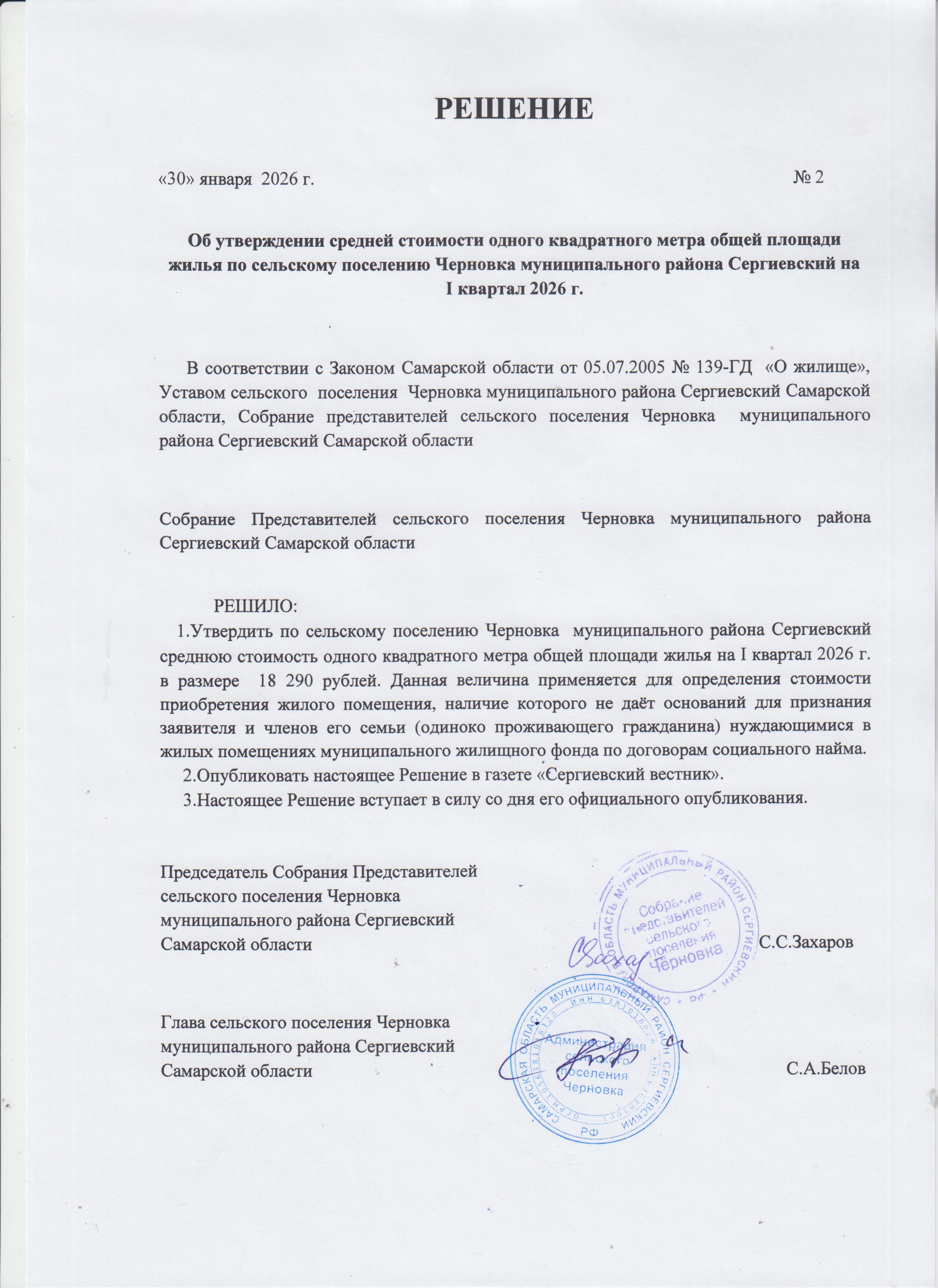 Решение №2 от 09.01.2025г Об утверждении средней стоимости одного квадратного метра общей площади жилья по сельскому поселению Черновка муниципального района Сергиевский на I квартал 2025 года